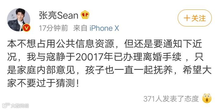 2019年11月29日一早,张亮发文宣布了与妻子寇静离婚的消息:“我与寇静于2017年已办理离婚手续 ,只是家庭内部意见,孩子也一直一起抚养,希望大家不要过于猜测!”