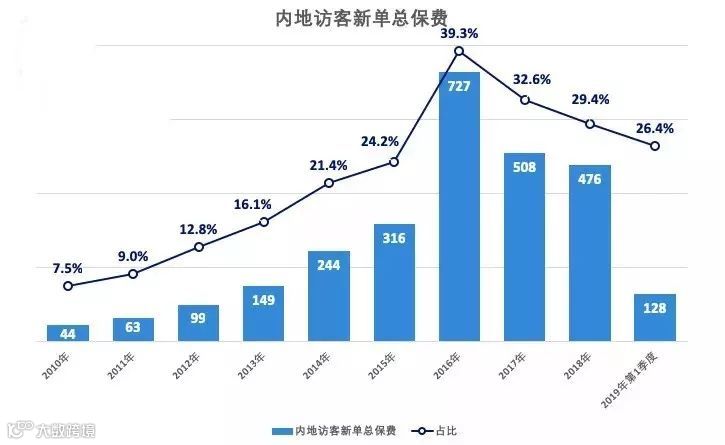 2019年一季度大陆客户贡献香港保险128亿港元,相比去年同期的118亿港元上升了两成。