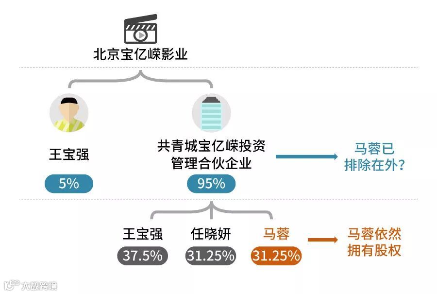 它的股权结构是“宝强股权 + 共青城宝亿嵘投资管理合伙企业股权=100%”。万万没想到的是,“共青城宝亿嵘投资管理合伙企业”为王宝强、任晓妍和马蓉共同持有,也就是说马蓉并未被排除在对“宝亿嵘影业有限公司”的持股权外。