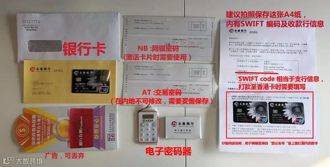 银行卡、密码函(2封,一封为AT交易密码,一封为NB网上银行初始密码。交易密码不可修改,请妥善保存;网上银行初始密码将在设置网银时填写,验证通过后可重设)、电子密码器、致客户信(内含银行RTGS编码、SWIFT CODE/SWIFT 编码,该编码相当于境内银行的开户行信息,转账时需填写,建议拍照保存)。如下图所示: