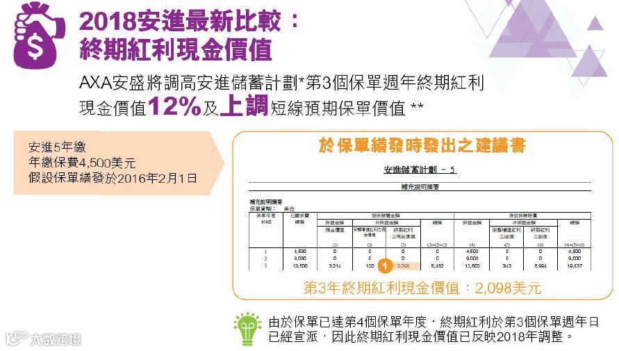 案例:【安进2-跃进】,女,保费40万美金,5年交。客户选择安盛的这款最新储蓄分红险,很有眼力,好产品不多说。