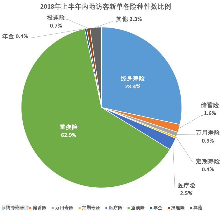 按新单保单数统计,内地访客购买重疾险的数量最多,持续上升,2018年上半年占比为62.9%,远高于2017年同期的55.8%,展现出香港重疾险对内地访客较强的吸引力;其次为终身寿险,占比28.4%,较2017年同期的35.5%有明显下降。