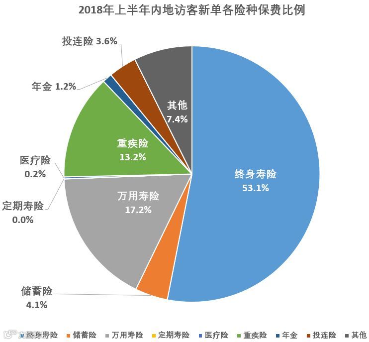 按新单保费统计,内地访客购买终身寿险的保费最多,2018年上半年占比为53.1%,与2107年同期相若;其次为万用寿险,占比17.2%;重疾险排名第三,占比13.2%,较2017年同期的8.6%有明显升高。
