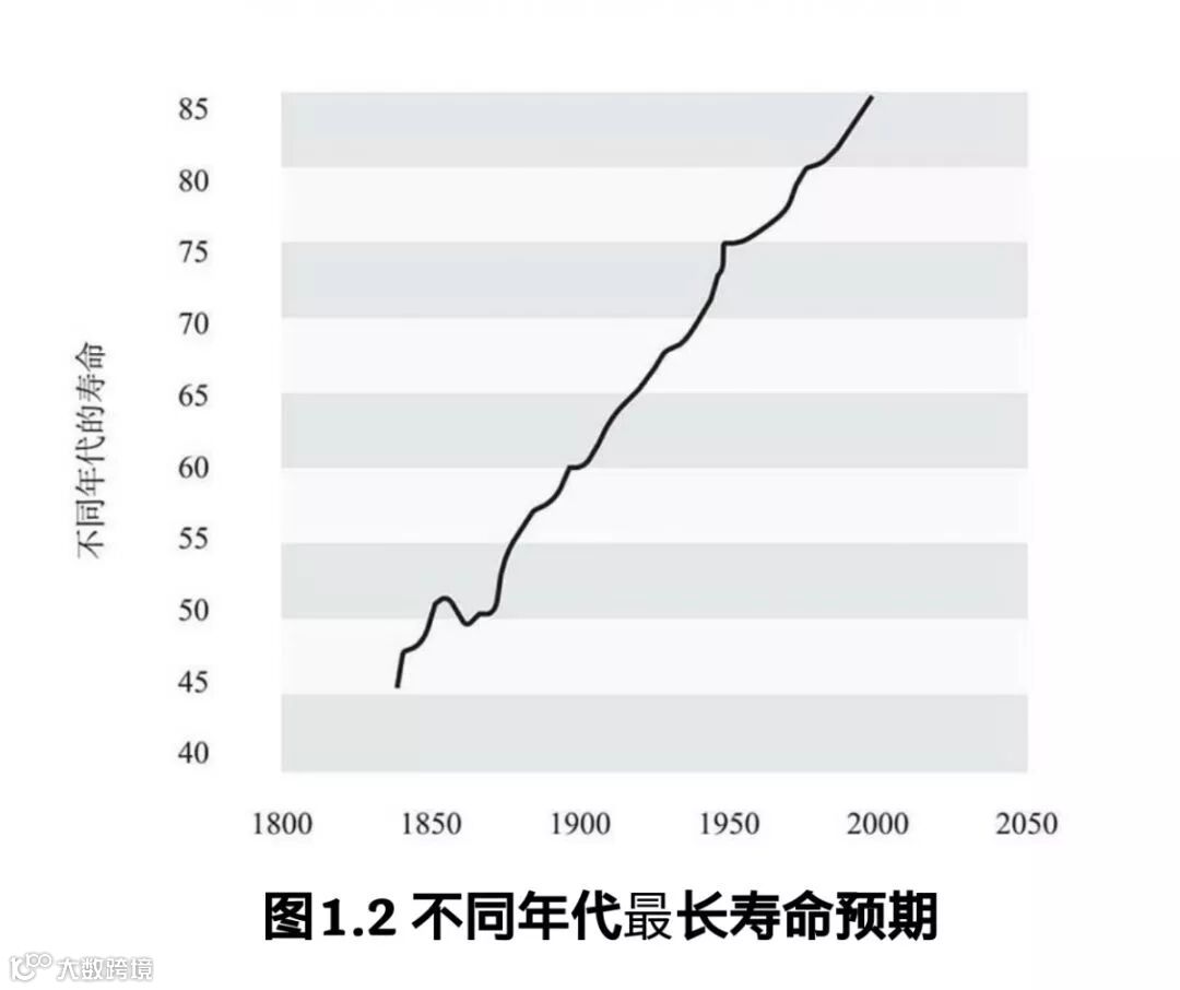 《百岁人生:长寿时代的工作和生活》一书中,作者根据加州大学伯克利分校与马克思·普朗克研究所人口研究中心共建的“人类死亡率数据库”提供的数据计算得出,基本上从1840年开始,预期寿命每10年就增长了2—3年。并且参考了世界经合组织和世界经济论坛专家的研究数据,得出结论:21世纪初出生的人有一半的概率活到100岁,这是关于长寿时代的一个基本事实。