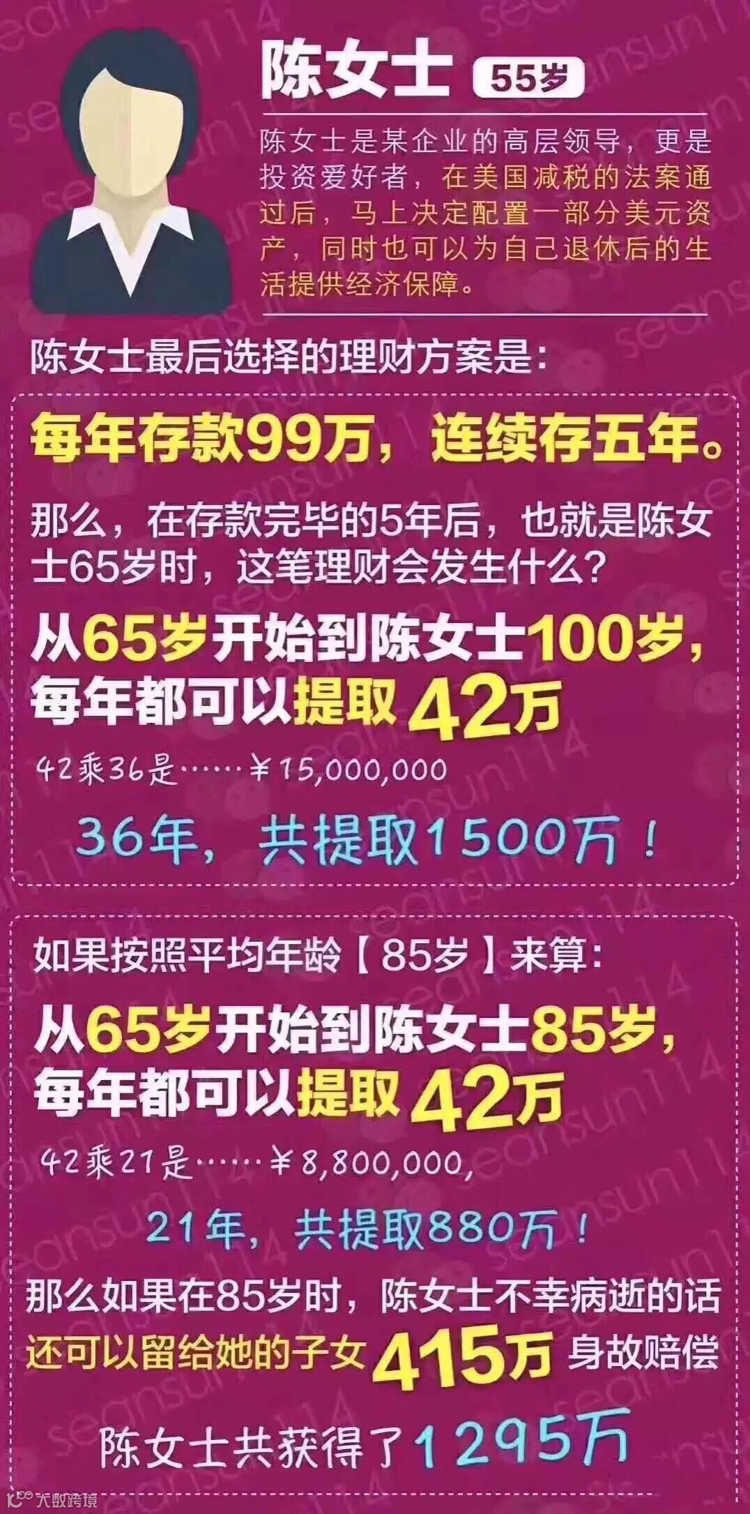 55岁每年投99万人民币,总共5年完成终身储蓄!提取详情见以下图片!