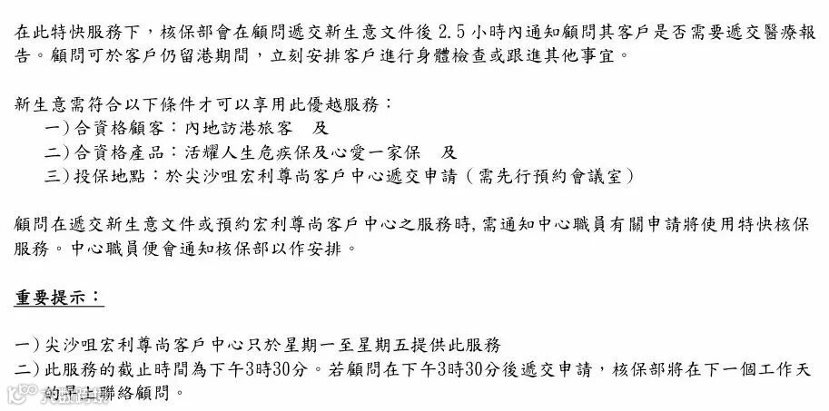 说的通俗点就是,客户投保后2.5小时内会知道核保结果,尤其是身体有健康状况的客户,避免反复提交报告,以及再次赴港体检。