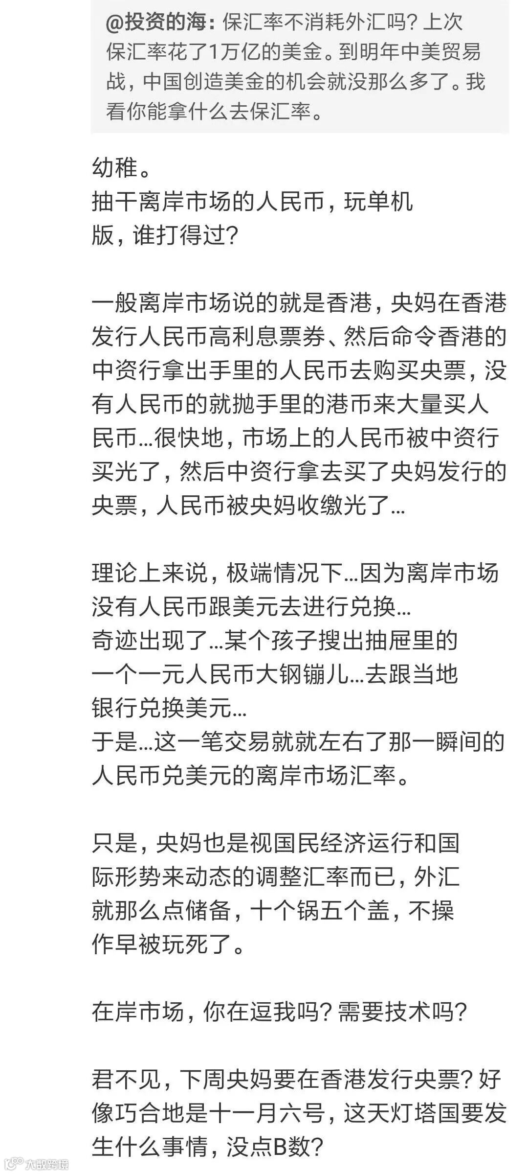 10月31日,中国银行香港的汇率挂牌卖出价报7.0043,正式破7。前天是香港的汇丰银行,昨天是中国银行香港,意味着离岸汇率正式进入7时代。好可怕!