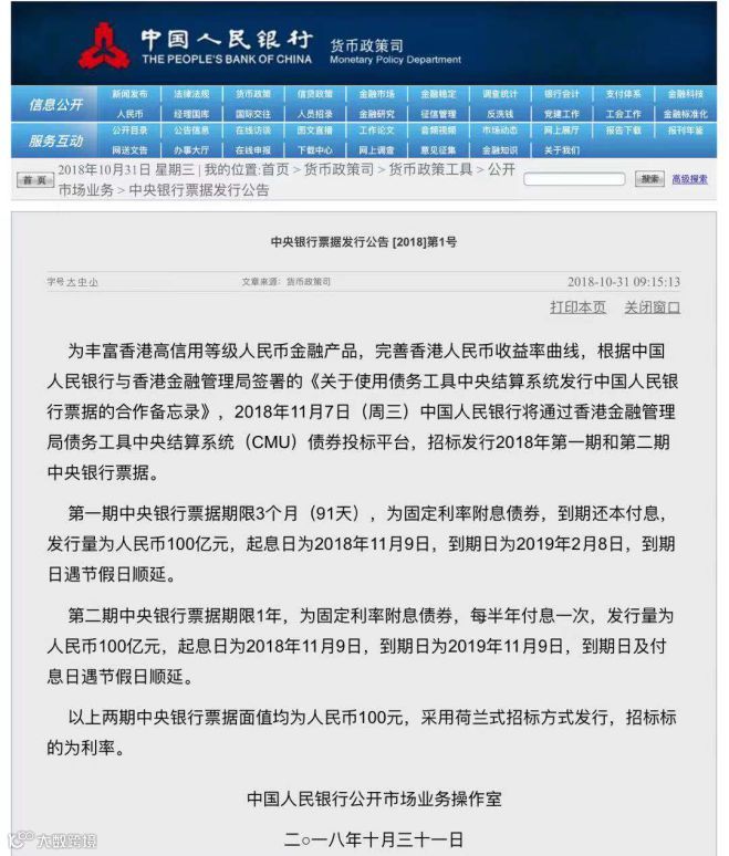 人行当天发布消息称,将于2018年11月7日通过香港金融管理局债务工具中央结算系统(CMU)债券投标平台,招标发行2018年第一期和第二期中央银行票据。