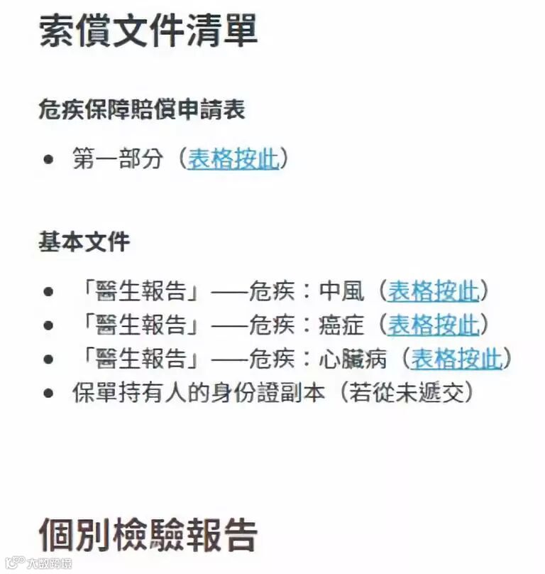 2、医生报告(例如癌症传送门http://www.aia.com.hk/content/dam/hk/pdf/form-library/claims/OPCLMF14.0513_cancer.pdf)