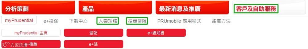 首先登陆网站找到客户自助服务页面(https://www.prudential.com.hk/scws/pages/tc/customer-support/epolicy-services/epolicy-services-home/)→→→客户及自助服务→→→人寿理赔(同页面也可以搜寻定点医院)