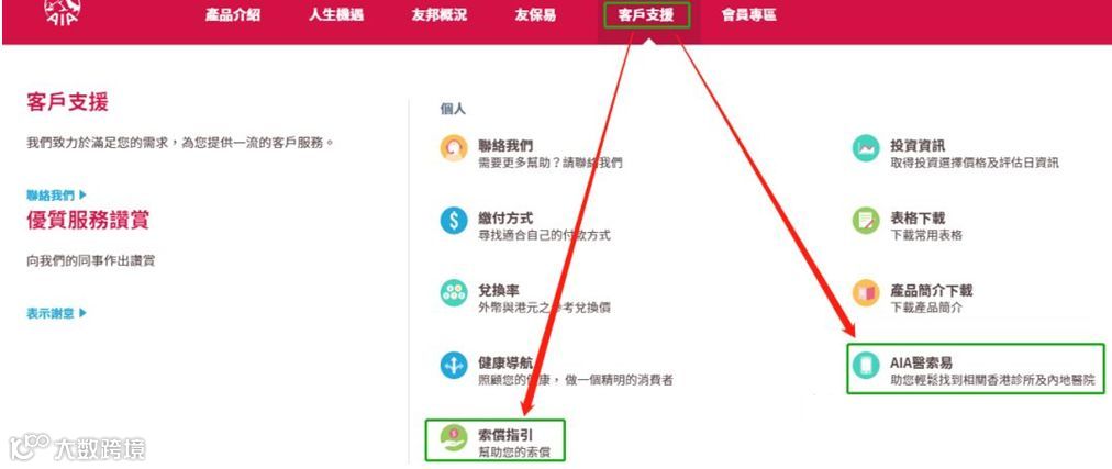 首先进入友邦官网http://www.aia.com.hk/zh-hk/index.html,页面鼠标放在“客户支援”上,会出现下拉选项,选择“索偿指引”(同页面也可以找到“AIA医索易”下载内地定点医院名录)