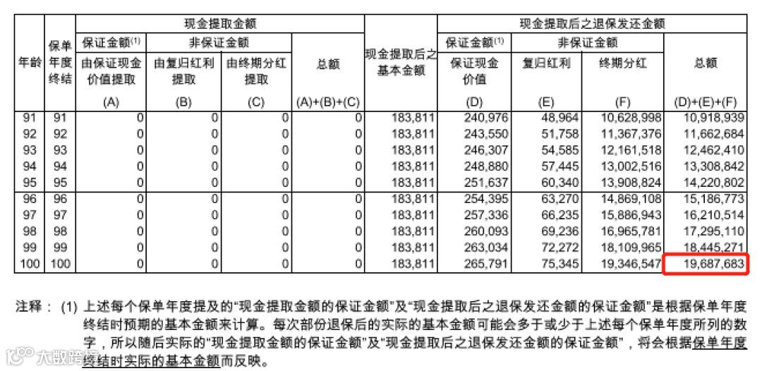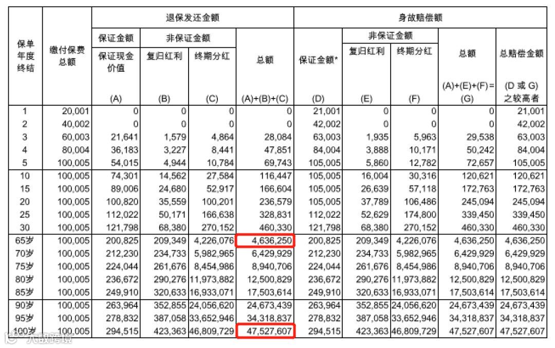 若Mark一直未提取现金,而选择让总现金价值在保单内继续滚存,则在100岁时保单预期总现金价值可高达47,527,607美元。