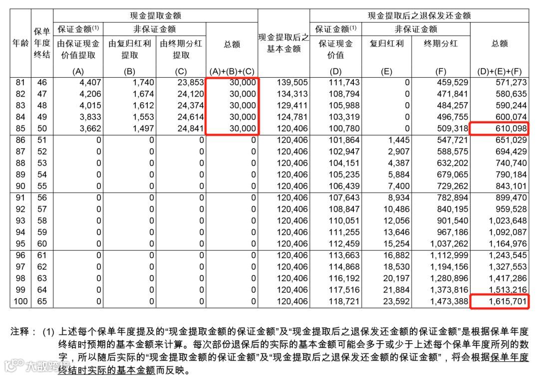 Ricky 85岁时保单预期总现金价值为61.0万美元