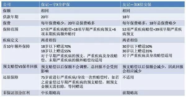 两家公司多重保产品的市场定位不太一样,就保障而言,保诚的加倍保相对更加全面,具体可以参考下图: