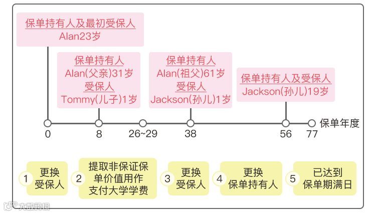 当Jackson已满19岁,Alan把保单的持有人转给他的孙子Jackson,将保单价值可以得以继续滚存。