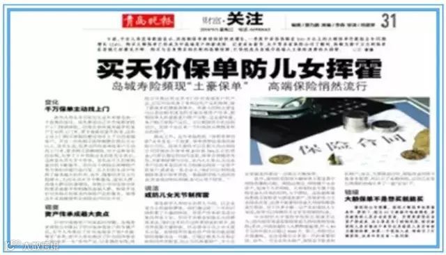 青岛一富豪签下天价保单,五年交费,年缴保费2亿元,共交10亿!据说这个富豪是经过和他的智囊团缜密研究后做出的购买决定,这个智囊谈包括专业的律师,会计师以及精算师。