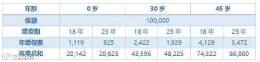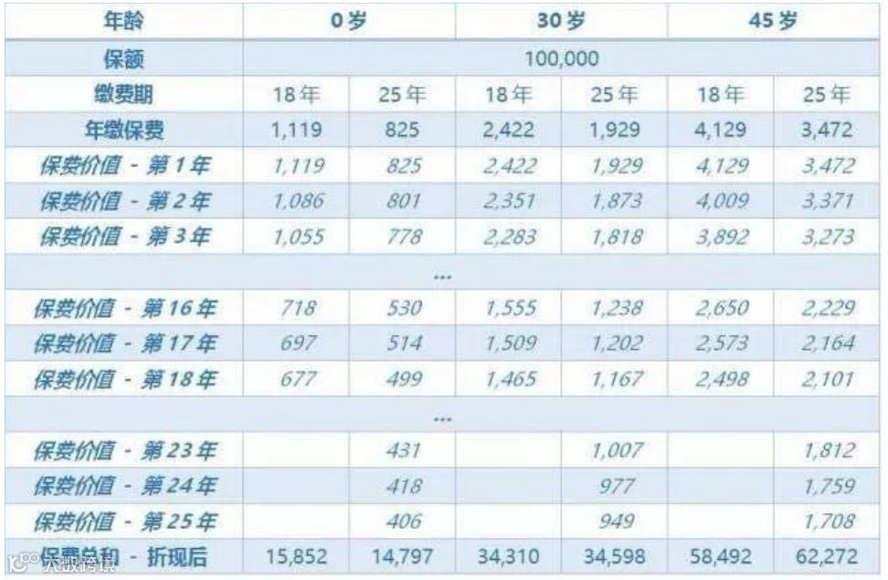 假如不关注「时间价值」的概念,那么25年缴的保费总和要比18年缴的保费总和高。然而考虑了「时间价值」的因素之后,对于0岁与30岁这两个年龄阶段,25年缴的保费总和与18年缴的保费 总和相差无几。