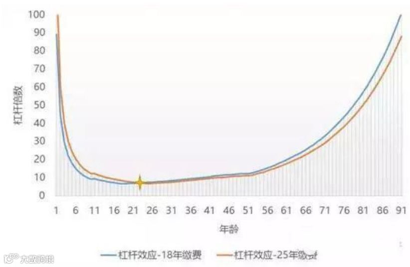 通过上 图可以看出,在23岁以前,25年缴费的保费杠杆作用是要强于18年缴费的;而在23岁以后,则 是18年缴费的杠杆作用更强一些。