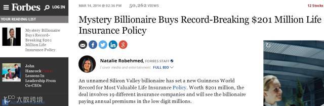 福布斯杂志(Forbes)在2014年3月份公布吉尼斯世界纪录 (GuinnessWorld Record) 史上最大的人寿保单:$201Million (2亿美元)。此庞大保单由19家保险公司共同承担责任。究竟这位赔率最高,生命最值钱的神秘人士是谁呢?
