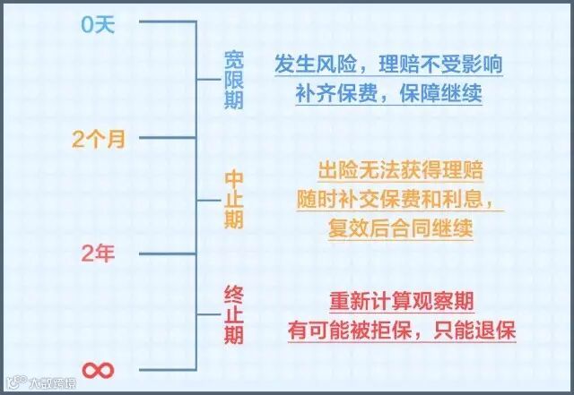 宽限期后还是没有缴费的话就进入了中止期,时间是2年。这时候就说我们上面提到的保单失效了,在这段时间内如果发生了风险,我们是没办法获得理赔的,因为保险公司不需要承担保险责任。这一点需要特别注意!