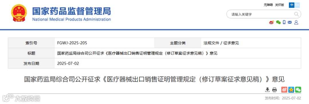 导读:国家药监局综合司公开征求《医疗器械出口销售证明管理规定(修订草案征求意见稿)》意见