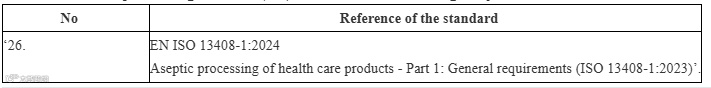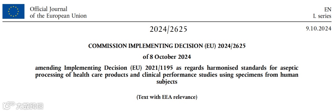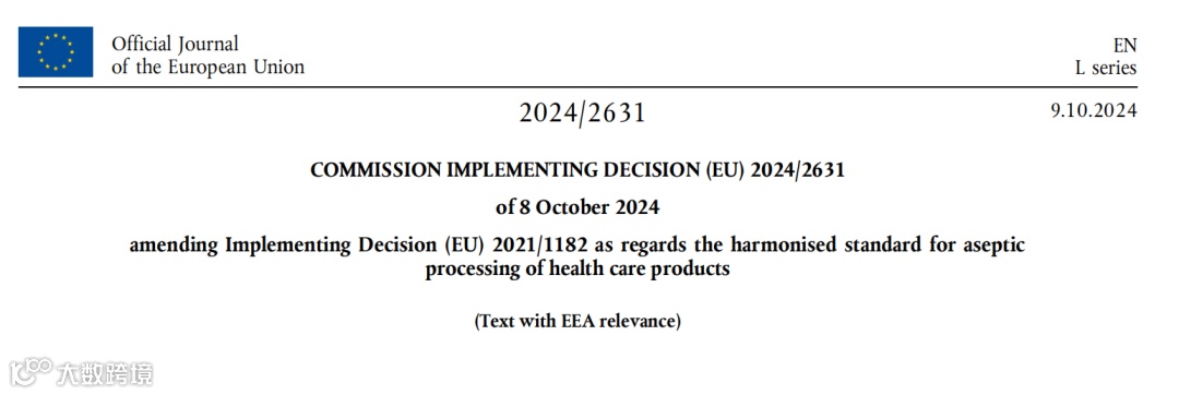 第一份是(EU)2024/2631,欧委会通过协调标准 EN ISO 13408-1:2024 用于医疗保健产品的无菌加工,支持医疗器械法规MDR的要求,将在医疗器械协调标准实施决定(EU) 2021/1182中纳入这一标准。