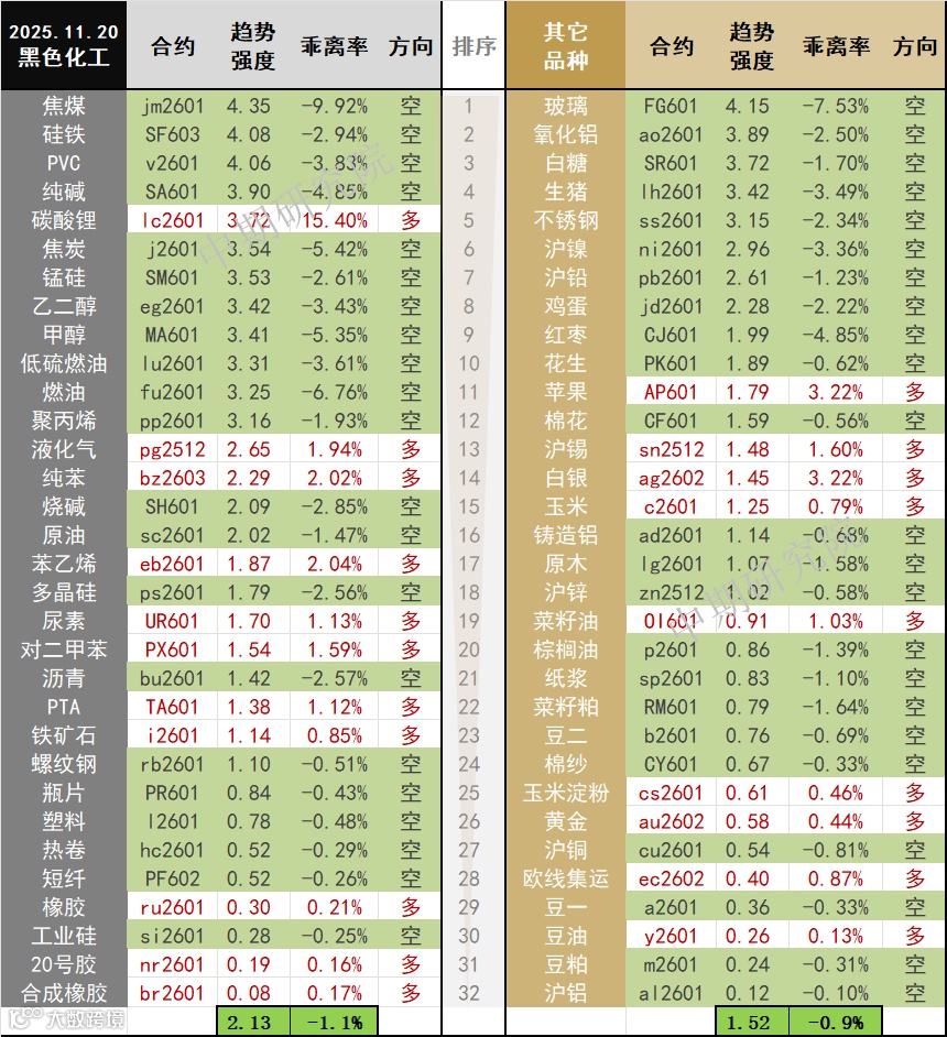 中期商品趋势榜 | 焦煤、硅铁、PVC空头强势 碳酸锂多头偏强(1120)