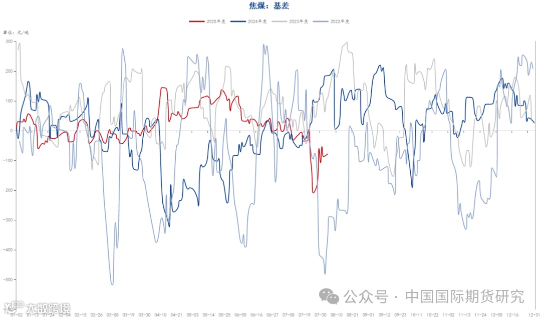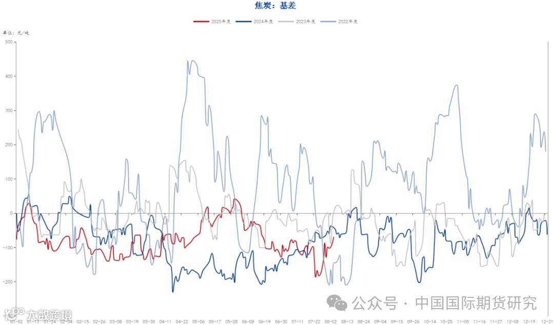 基差方面,截至七月最后一个交易日,焦煤主力合约基差在-53.5元/吨,焦炭主力合约基差在-99元/吨,焦煤基差连续回落,主要是近期市场对于焦煤后市偏向乐观,期货价格表现相对偏强所致,另外焦炭方面,基差与月初相对变化不大,主要是焦炭连续几轮提涨后,市场对于后续焦炭能否再度提涨存在一定的分歧所致。