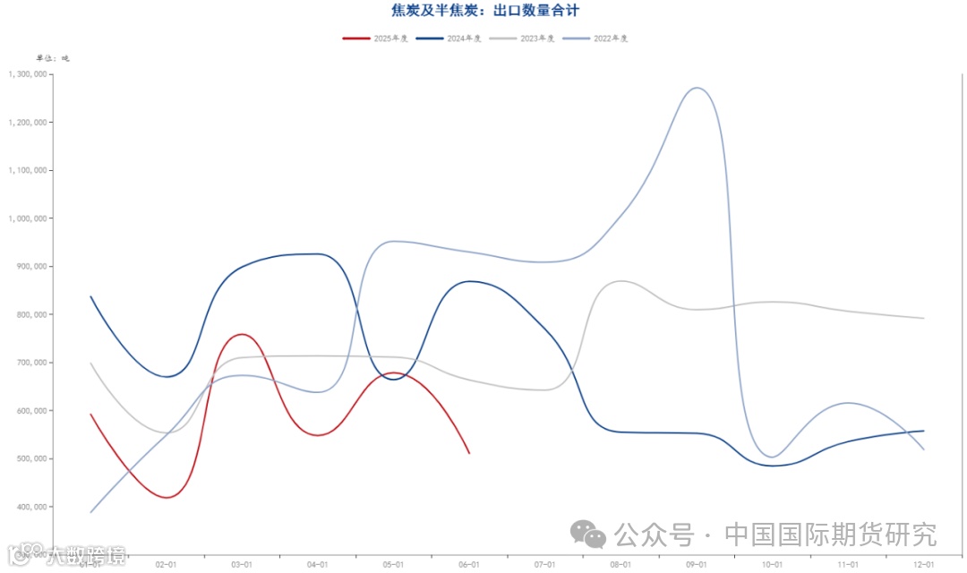 出口方面,根据海关总署公布的出口焦炭数据,6月份,中国出口焦炭及半焦炭51万吨,同比下降41.3%,1-6月份累计出口351万吨,同比下降27.9%。焦炭出口延续小幅回落态势。