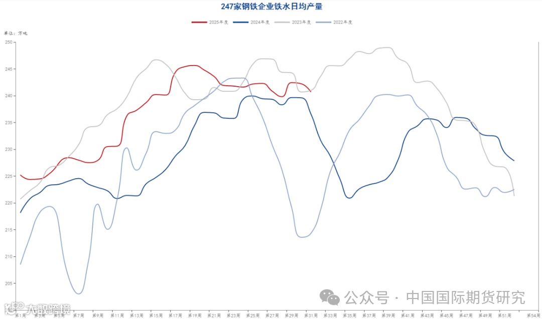 统计局最新一期公布的数据显示,6月份国内粗钢产量8318万吨,同比下降9.2%;生铁产量7191万吨,同比下降4.1%;钢材产量12784万吨,同比增长1.8%。1-6月份,国内粗钢产量51483万吨,同比下降3.0%;生铁产量43468万吨,同比下降0.8%;钢材产量73438万吨,同比增长4.6%。此外,钢联高频数据显示,最新一期的247家钢厂日均铁水产量240.71万吨,环比上一期减少1.52万吨,降幅0.63%。目前看,由于当前钢厂利润小幅回落,叠加近期钢材消费进入到传统的淡季,后续铁水产量或仍有进一步回落的可能。