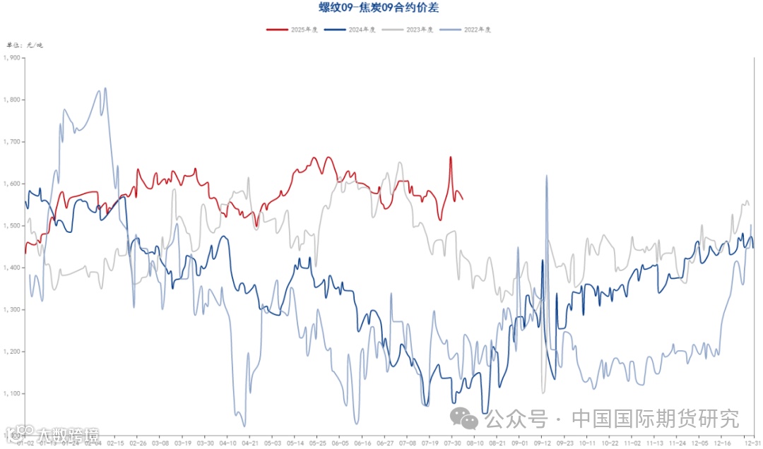 跨期价差方面,焦煤9-1合约价差七月最后一个交易日为-89.5点,与月初相比小幅回落,主要是市场即将进入到交割月,近月合约仓单压力偏高,而远月合约市场仍有一定的涨价预期所致。焦炭9-1合约价差七月最后一个交易日为-53.5点,与月初相比略有回落,主要是近期焦炭连续提涨后钢厂接受度正在降低,近月合约再度提涨的概率越来越小,而远月仍有一定的提涨预期所致。跨品种价差方面,七月最后一个交易日焦炭和焦煤主力合约的价差为555.5点,价差与月初相比变化不大,主要是近期焦煤近期价格连续上涨而焦炭也有五轮的提涨,两者价格走势较为一致所致。9月合约七月最后一个交易日螺纹钢和焦炭的价差为1557点,价差与月初相比基本持平,主要是近期市场螺纹和焦炭价格均有一定的上涨所致。