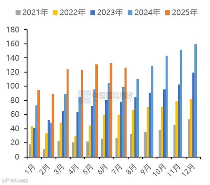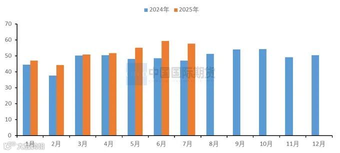 根据SMM数据显示,1-7月国内氧化铝累计产量为5133.074万吨,同比增长8.14%。7月中国冶金级氧化铝产量为765万吨,环比增加5.40%,同比增加6.65%。截至7月底,中国冶金级氧化铝的建成产能约11032万吨,实际运行产能环比上升2.00%,开工率为81.6%。氧化铝期货在宏观“反内卷”、“去产能”等政策消息的刺激下明显走强,在期现套利窗口开启的背景下,期现商询盘采购的积极性较高,现货货源收紧,持货方挺价惜售,进而推动了氧化铝现货价格跟涨。7月氧化铝企业盈利水平得到一定程度的修复,除个别常规检修外,未出现减产检修情况,运行产能提较6月增加177万吨。