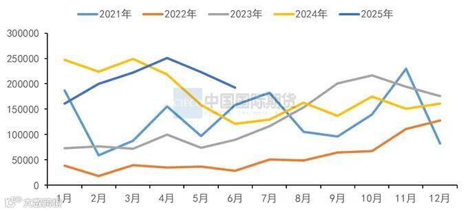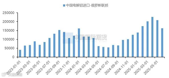 电解铝进口方面,自2020年以来,中国原铝进口量保持强势增长势头,实现了向铝锭进口国的转变。2024年中国累计进口电解铝为213.6万吨,占国内总供应的比例约4.63%。步入2025年,虽然前3个月中国原铝的进口量不及去年同期水平,但仍处于近五年历史同期高位。步入6月后,据海关总署数据显示,6月我国原铝进口量为19.24万吨,环比减少13.8%,同比增加58.7%。主要是通过“海关特殊监管区域物流货物”以及“出料加工贸易”贸易方式下进口的普铝锭,占比分别为34.8%、26.9%。从进口来源国看,俄罗斯是国内原铝进口的第一来源国,继5月自俄罗斯的进口量下滑后,6月依旧延续跌势,6月进口量为16.2万吨,环比下降22%,不过在进口总量中的占比仍高达84.4%。1-6月国内原铝累计进口总量约124.99万吨,同比增长2.5%。虽然上半年受海外电解铝供应趋紧及进口窗口间歇性关闭的影响,中国自部分国家/地区的进口量有所回落,但自俄罗斯的进口量仍实现了大幅增长,因此使得原铝进口总量仍处于历史偏高水平。上半年中国自俄罗斯进口电解铝的占比高达89%。事实上,自去年11月以来,中国自俄罗斯进口原铝的占比快速提升。这主要由于欧美对俄铝的制裁加深了全球铝锭供应结构性矛盾。在地缘冲突背景下,中俄两国在经贸领域的合作日趋紧密,俄罗斯金属或常态化进入中国。此外,印度尼西亚是第二大供应国,6月从印度尼西亚进口原铝11347吨,环比增加43.09%,同比增加7.09%,占5月进口量的5.9%。