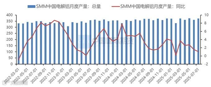 据SMM统计,7月海外电解铝总产量同比增长2.7%,月平均开工率为88.5%,环比下降0.8%,但同比仍小幅提高0.2%。经历4月的大规模停电后,西班牙SanCiprián冶炼厂已开始分批重启,计划在明年年中前恢复至22.8万吨的名义产能。巴西Alumar冶炼厂在三年分批复产后,产能利用率已达到92%,约41.1万吨/年,目前正冲刺满产;非洲South32尚未与能源供应商HCB就明年之后的电力协议达成一致,Mozal产能58万吨/年的冶炼厂存在部分停产风险,谈判仍在进行;澳大利亚的Tomago冶炼厂同样面临着电力问题的困扰,该厂正与澳大利亚联邦及新南威尔士州政府就2026–2029年的电力合同及联邦生产税收抵免进行谈判,但尚未达成协议;此外,印度BALCO的电解铝扩产产线完成调试后,7月已开始放量。整体而言,7月海外电解铝供应整体表现持稳,但部分冶炼厂的中长期前景仍有不确定性。8月随着BALCO继续爬产,海外电解铝产量预计同比增长约3%,开工率有望回升至88.8%。