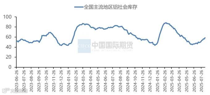 自6月下旬以来,国内整体铝锭供应有所放量,同时消费处于淡季,铝锭社会库存整体呈现出累库趋势。近期国内铝锭到货不均导致库存有阶段性波动,但铝价处于相对高位水平,可能抑制下游消费积极性,预计短期铝锭库存将延续累库趋势。截至8月11日,国内铝锭库存为58.7万吨,较一周前增加2.3万吨,较7月初增加11.3万吨,较去年同期下降24.1万吨。