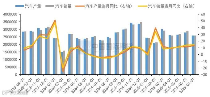 国内汽车行业在经历高速增长到平稳发展的转变后,市场竞争格局正愈发严峻,但政策环境优化和市场需求升级给汽车行业带来了新的增长点。今年以来,在新一轮以旧换新政策加力扩围并提前落地的同时,企业技术升级和产品焕新也刺激了车市需求,共同推动了汽车产销稳步增长。今年1-7月汽车产销分别完成1823.5万辆和1826.9万辆,同比分别增长12.7%和12%,产销增速较1-6月分别扩大0.2和0.6个百分点。7月汽车经销商库存预警指数为57.2%,同比下降2.2%,环比上升0.6%,库存预警指数位于荣枯线之上,汽车流通行业景气度有所下降。7月汽车产销分别完成259.1万辆和259.3万辆,环比分别下降7.3%和10.7%,同比分别增长13.3%和14.7%。7月车市步入传统淡季,在部分厂家安排年度设备检修的同时,受部分地区补贴政策阶段性退坡、汽车消费金融返佣下调及厂家促销力度收缩的影响,消费者持有观望心态。因此产销节奏放缓,环比出现季节性回落走势。但得益于以旧换新政策继续显效、行业整治“内卷”工作取得积极进展、企业新车型密集投放等多重利好的提振,前期积累订单得到有效消化,7月汽车产销同比增幅仍超过10%。