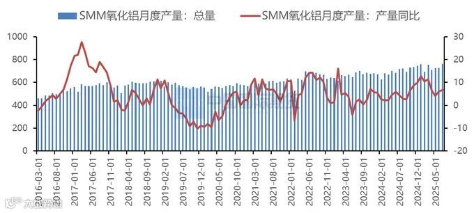 2023年4季度,山西部分铝土矿山因安全生产事故停产,2023年6月起,河南三门峡地区铝土矿因执行复垦大量停产,在此背景下,2024年铝土矿产量基数偏低。步入2025年后,山西、河南铝土矿整体供应量有所增长。据SMM数据显示,2025年1-7月山西铝土矿产量为1063.4万吨,同比增长21.83%。2025年1-7月河南铝土矿产量为309.11万吨,同比增长10.88%。2025年1-7月中国铝土矿产量为3583万吨,同比增长9.21%。就7月而言,7月中国铝土矿产量为543.45万吨,同比增长7.42%。其中7月广西铝土矿产量为221.77万吨,同比增长8.91%,山西铝土矿产量为155.46万吨,同比增长12.38%。7月贵州铝土矿产量为93.42万吨,同比增长5.04%。7月河南铝土矿产量为44.66万吨,同比下滑4%。目前国产铝土矿市场整体维持平静,以持稳运行为主。8月10日,山西省自然资源厅下发通知,决定调整部分矿种出让登记权限,通知明确,上收陶瓷土、耐火粘土、高岭土、铁矾土等4个矿种的出让登记权限至省自然资源厅,同步上收矿业权出让收益评估、矿产资源储量评审备案等事项的管理权限,以加强铝土矿及镓等战略性矿产资源保护,促进整体出让,提升综合开发利用能力。消息公布后,对氧化铝期货盘面曾有短暂的刺激作用。