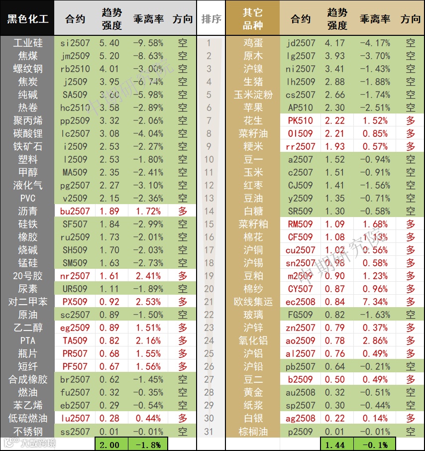 中期商品趋势榜 | 工业硅、焦煤、鸡蛋、螺纹钢、焦炭、原木空头强势 (0527) 中国国际期货福建分公司