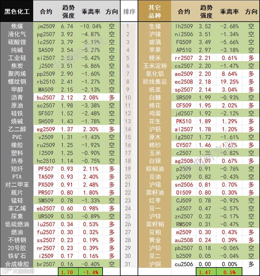 中期商品趋势榜 | 焦煤、液化气、碳酸锂、纯碱、工业硅、生猪空头强势(0523)