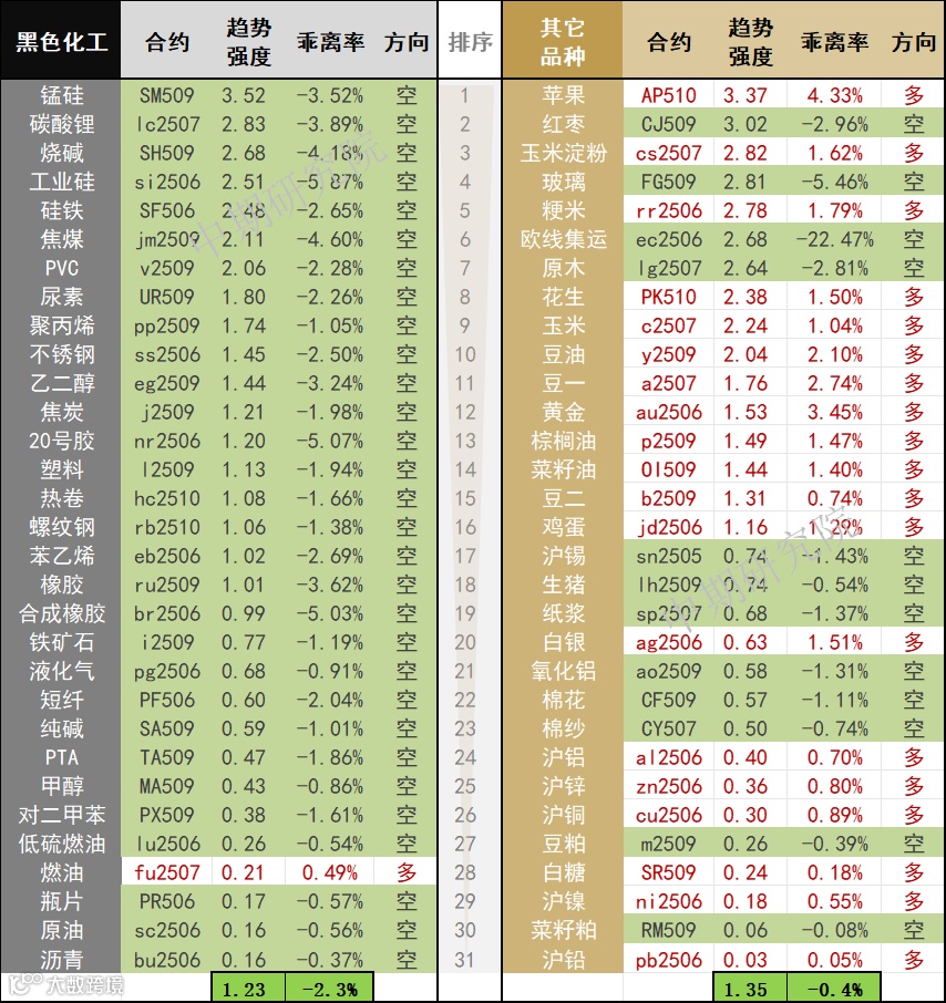 中期商品趋势榜 | 锰硅、红枣、碳酸锂空头偏强 苹果、玉米淀粉多头偏强(0425)