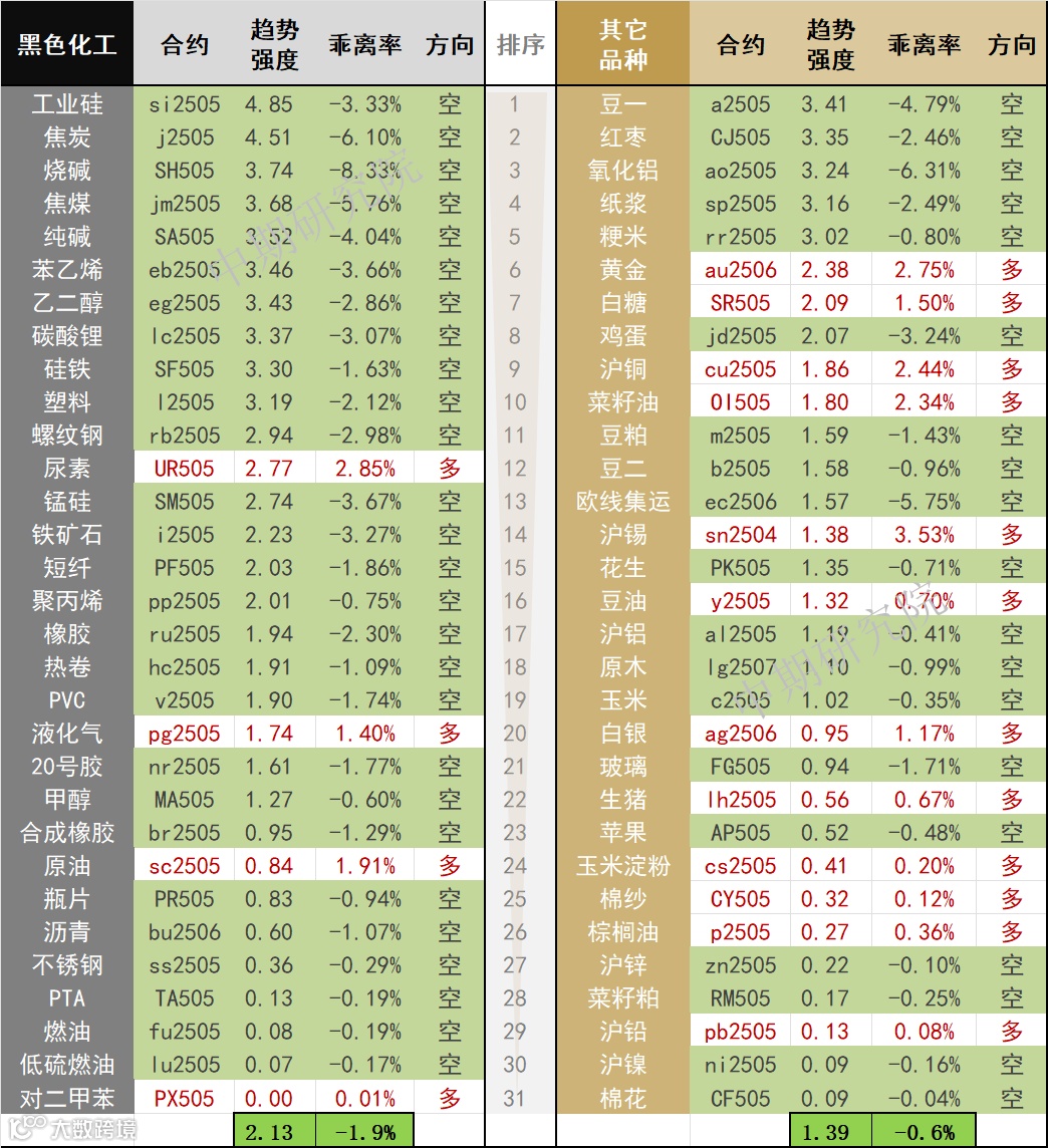 中期商品趋势榜 | 工业硅、焦炭、烧碱、焦煤、纯碱、苯乙烯空头强势 尿素、黄金多头持续(0321)