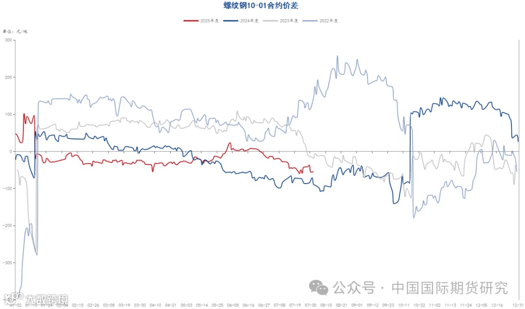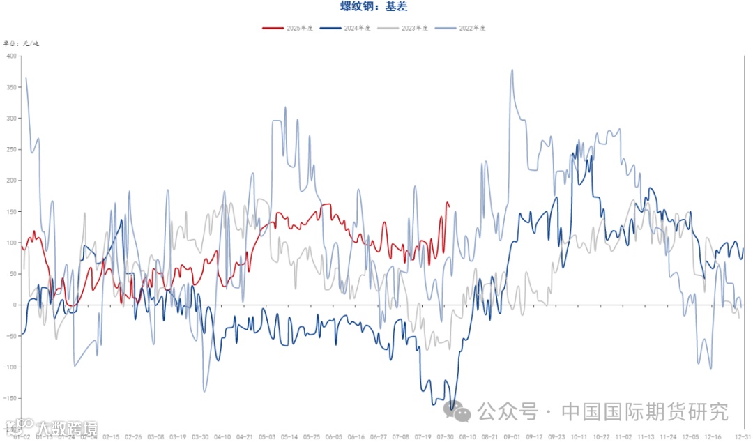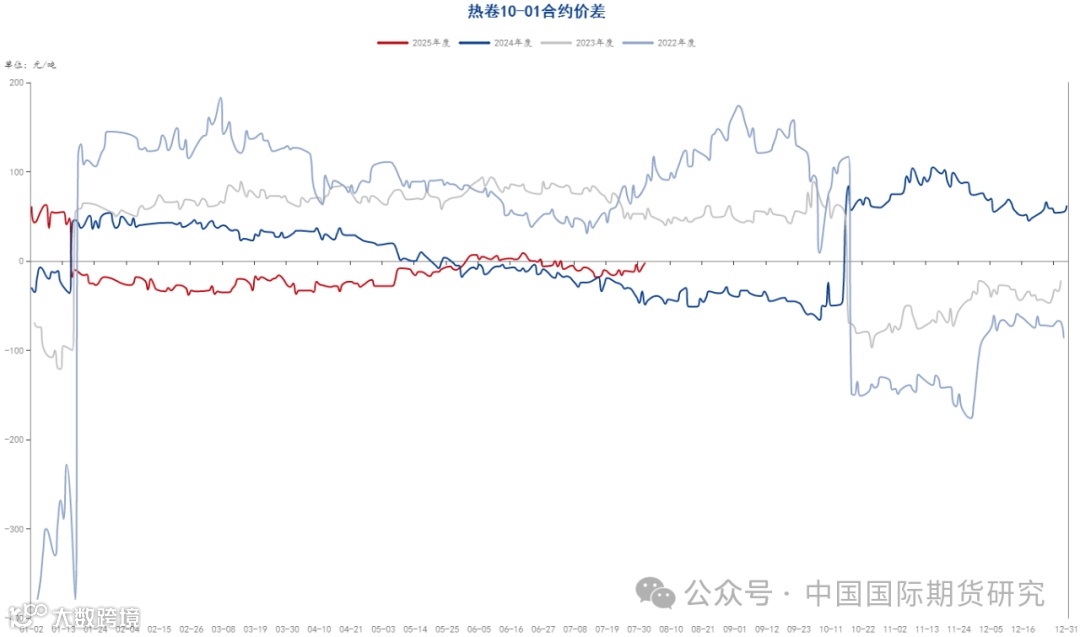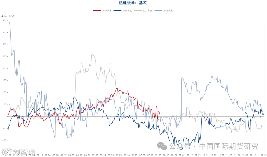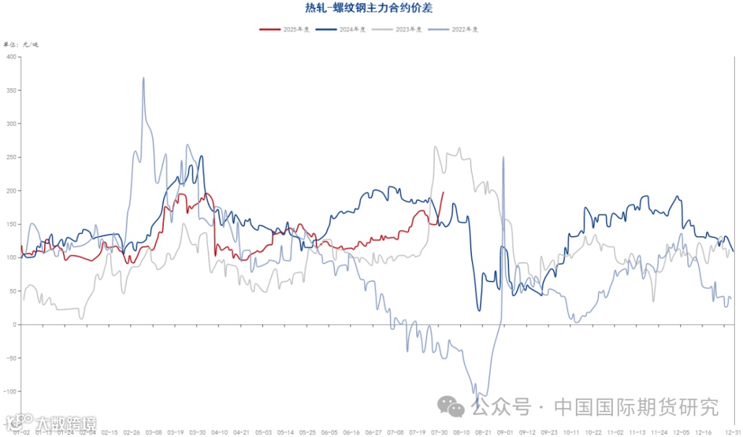 期现方面,至七月最后一个交易日,螺纹主力合约基差为165元/吨,热卷主力合约基差为20元/吨,螺纹钢基差较月初小幅增加,热卷基差较月初有所回落,主要是螺纹近期仍处于消费的淡季,虽然上月价格有所上涨,但下游拿货意愿不足,而热卷近期供需基本平衡,市场对于后市仍抱有一定的期待,基差收敛也较为明显。另外从 基差历史情况 看,卷螺基差当前仍处于历史偏高位置,后续仍有一定修复的可能。