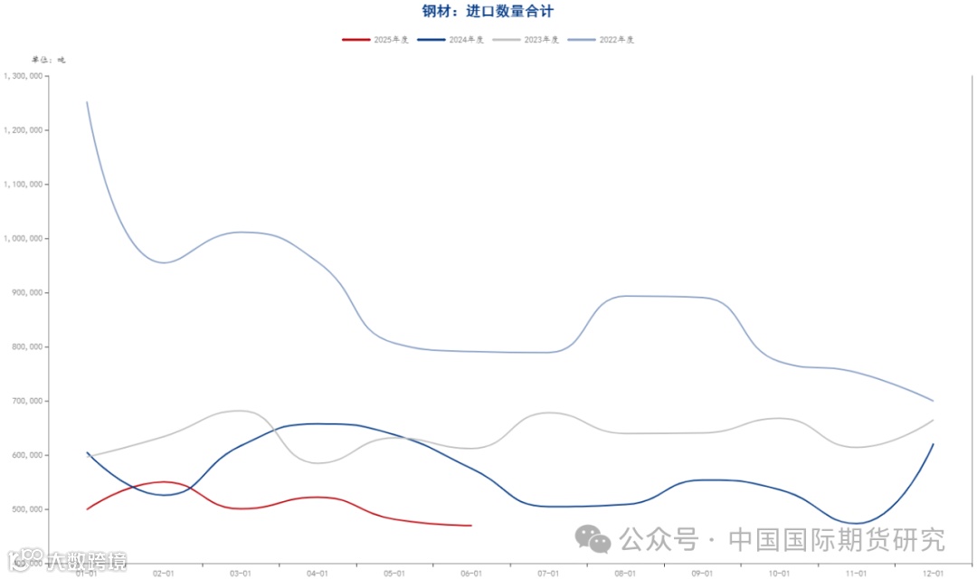 进口方面,6月份,我国进口钢材47.0万吨,环比下降2.4%,进口均价1712.5美元/吨,环比下跌2.1%。1-6月,我国累计进口钢材302.3万吨,同比下降16.4%,进口均价1686.4美元/吨,同比上涨2.2%。