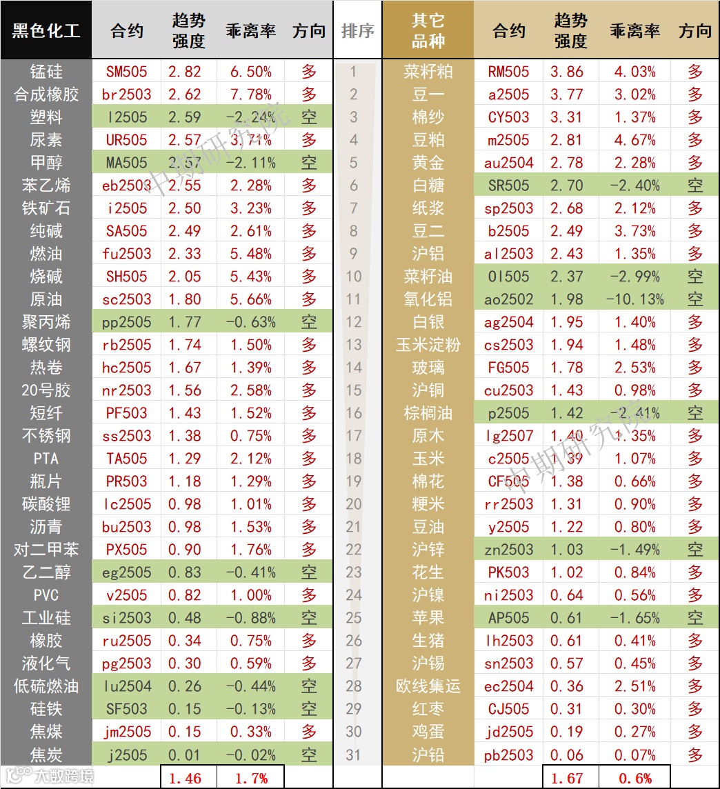中期商品趋势榜 | 菜粕、豆一、棉纱、锰硅、豆粕、黄金多头偏强 (0122)