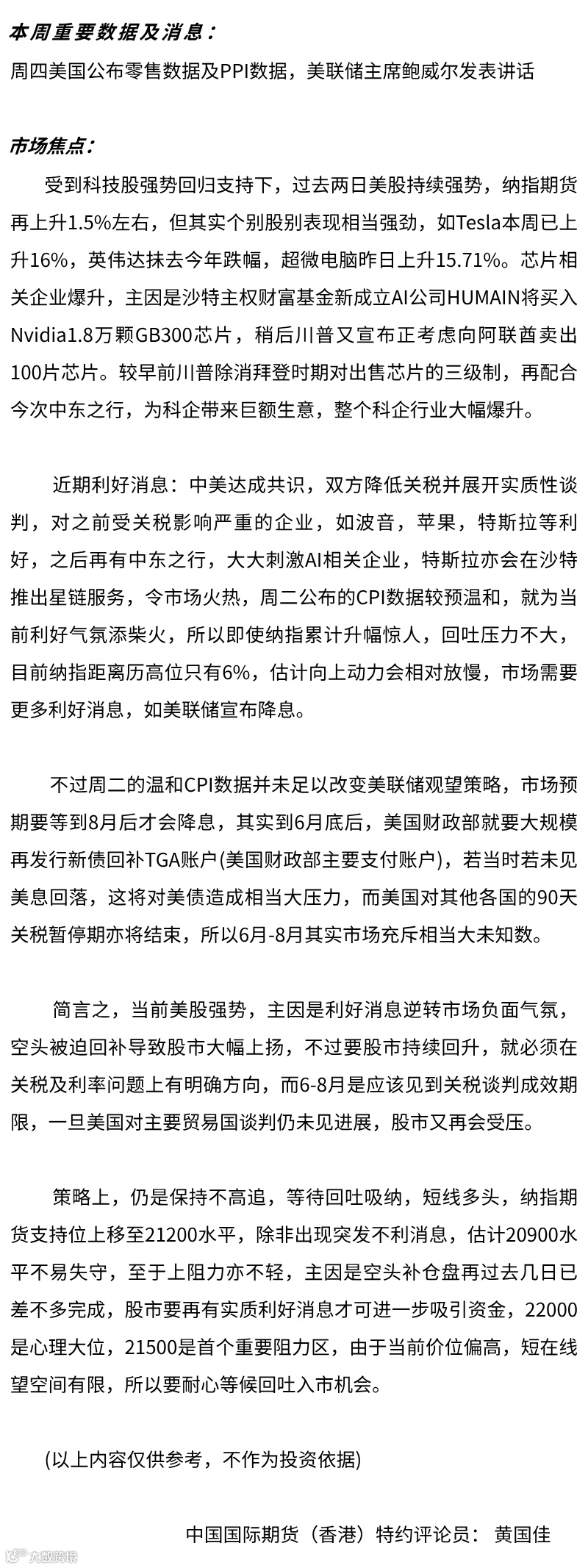 请注意,本专栏由中国国际期货(香港)有限公司特约市场评论员撰写,本信息或其中表达的任何意见仅代表评论员立场,不代表中国国际期货股份有限公司观点和立场,均不构成招揽买卖任何期货或期权合约。交易期货合约和商品期权涉及重大损失风险,因而并不适合所有投资者。投资者应结合自己的财务状况认真考虑该等投资的固有风险。投资有风险,入市需谨慎。