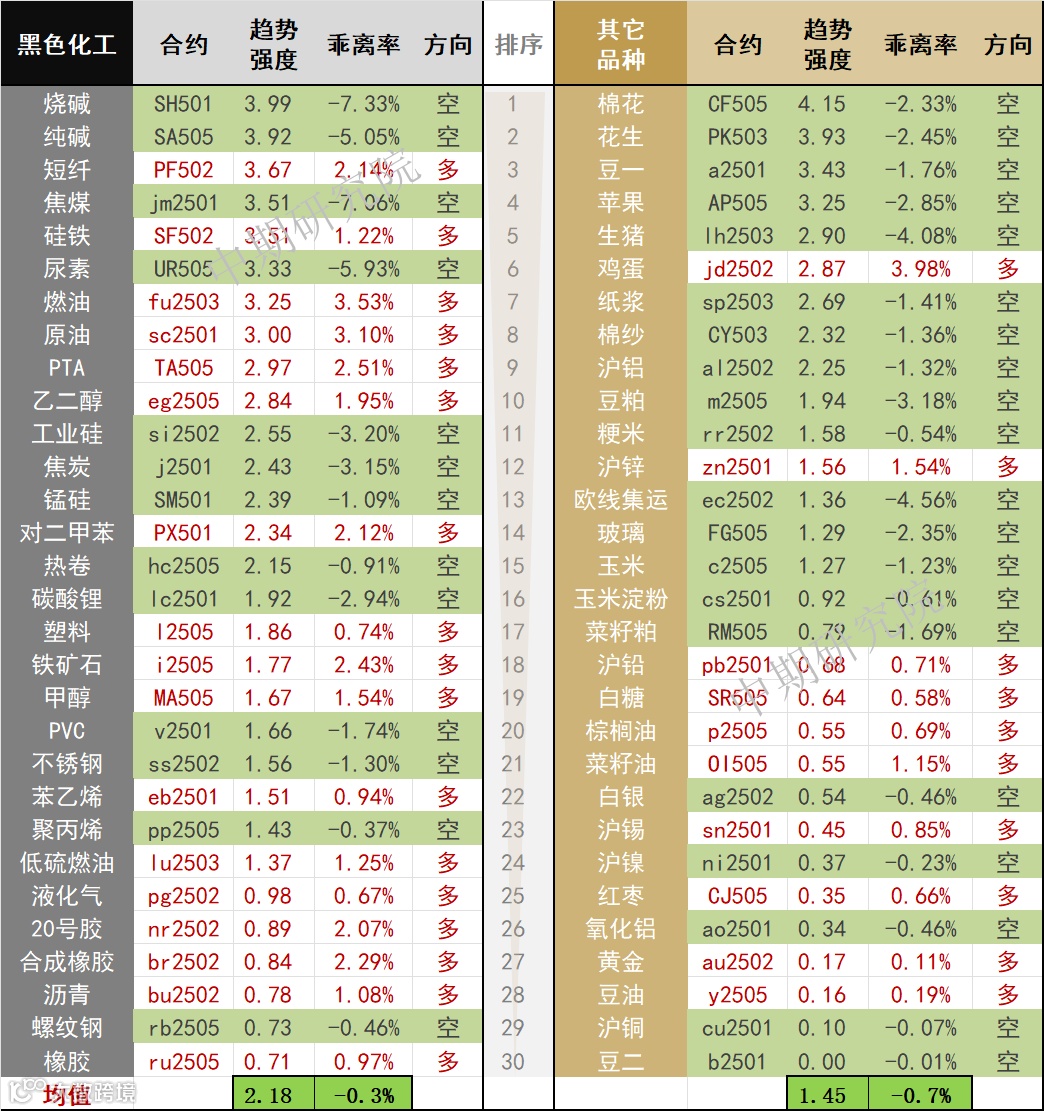 中期商品趋势榜 | 棉花、烧碱、花生、纯碱空头强势 短纤、硅铁多头偏强 (1216)