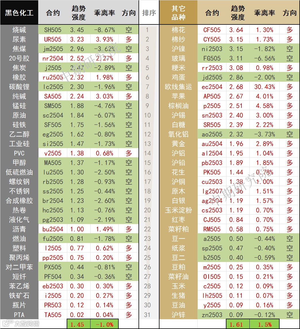 中期商品趋势榜 | 烧碱、沪镍、玻璃空头强势 棉花、尿素、棉纱多头偏强(0217)