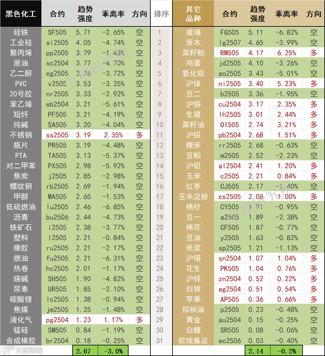 中期商品趋势榜 | 硅铁、玻璃、原木、鸡蛋、工业硅空头强势 菜粕、沪镍、不锈钢、沪铜多头偏强 (0312)