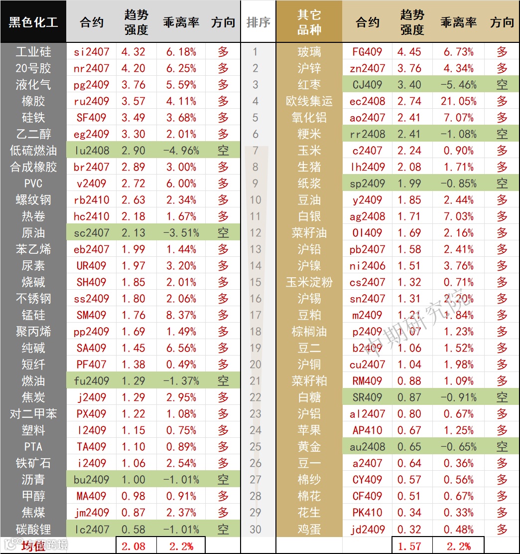 中期商品趋势榜 | 玻璃、工业硅、沪锌、液化气、橡胶多头强势(0524)