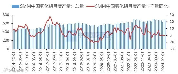 氧化铝产量方面,SMM数据显示,4月中国冶金级氧化铝产量为667.9万吨,环比减少1.51%,同比增加2.20%。日均产量环比增加0.39万吨/天至22.26万吨/天。截至4月末,中国氧化铝建成产能为10000万吨,运行产能为8127万吨,全国开工率为81.3%。上周全国氧化铝周度开工率较前一周小幅下降0.07%至81.67%。SMM预计5月日均产量为22.43万吨/天,总运行产能约8187万吨,同比上涨3.5%。